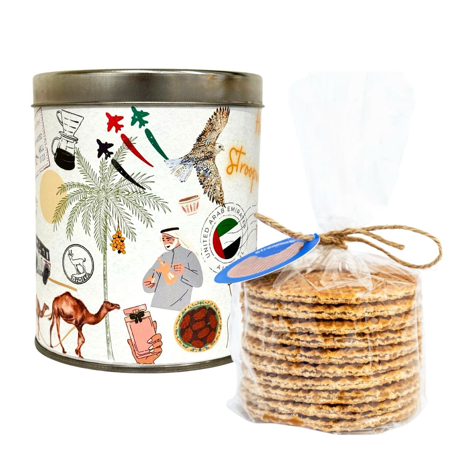 10 pieces of medium-sized Stroopwafel filled with caramel in a special “It’s Abu Dhabi or nowhere” tin. Beautiful souvenir, gift or memory