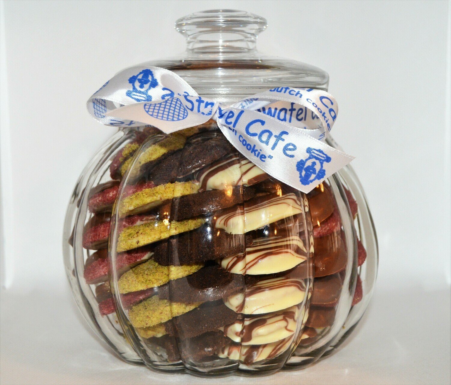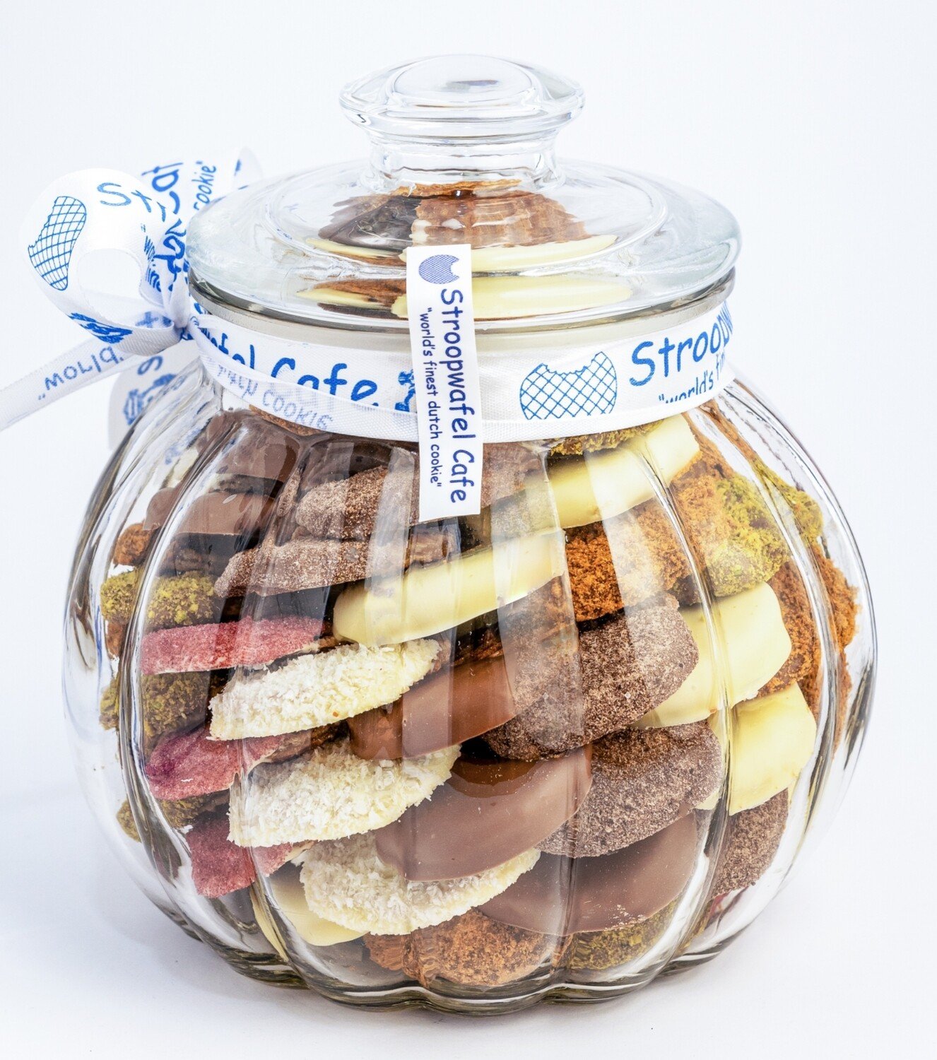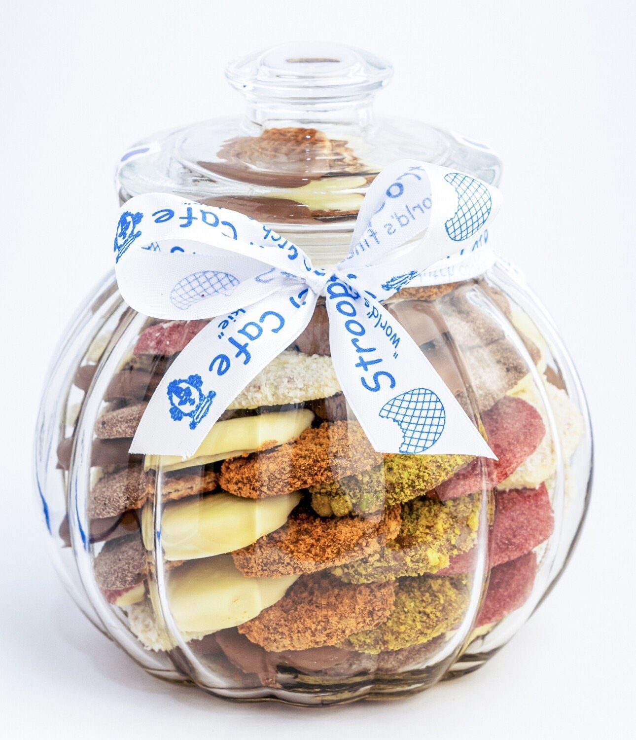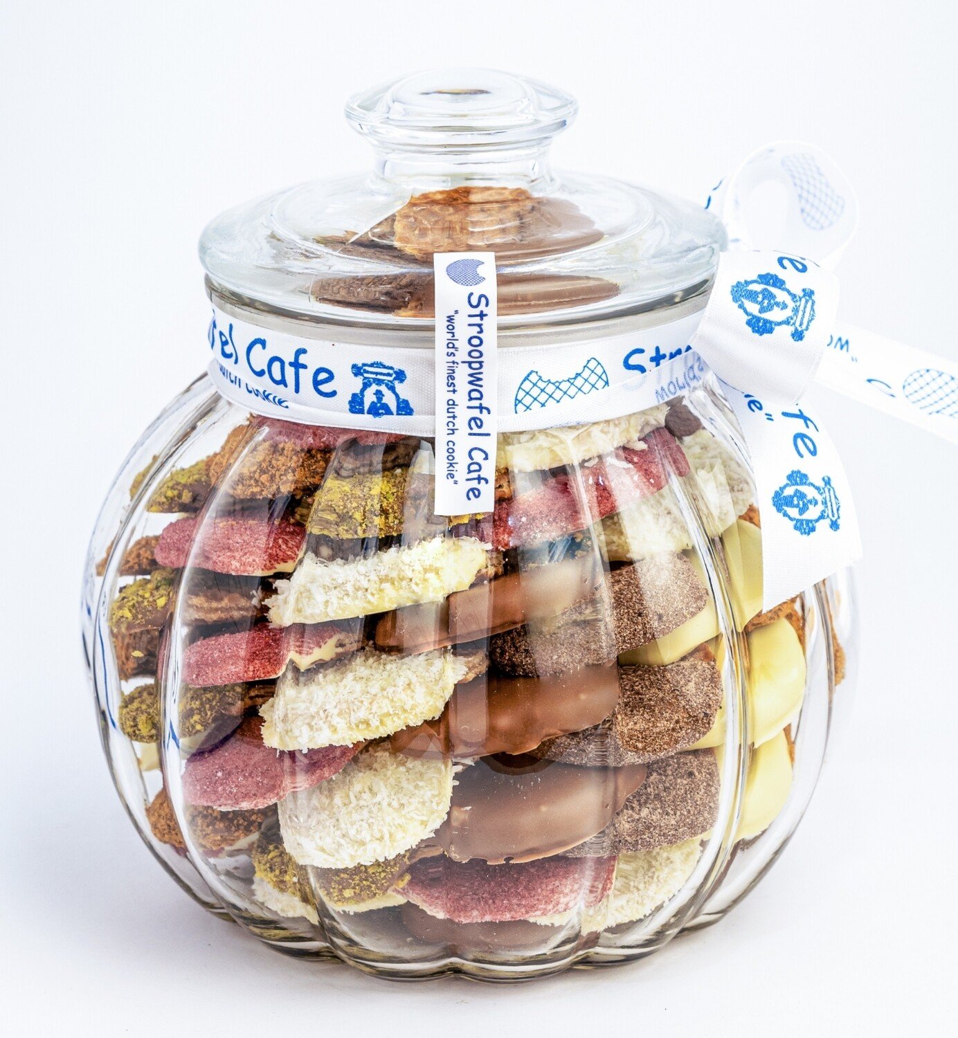~75 mini pieces of different mixed flavoured Stroopwafels arranged in circles on top of each other inside a glass jar. Each Stroopwafel is two thin layers of waffle filled with caramel in between, dipped in chocolate and covered with different flavour. Chewy and soft.