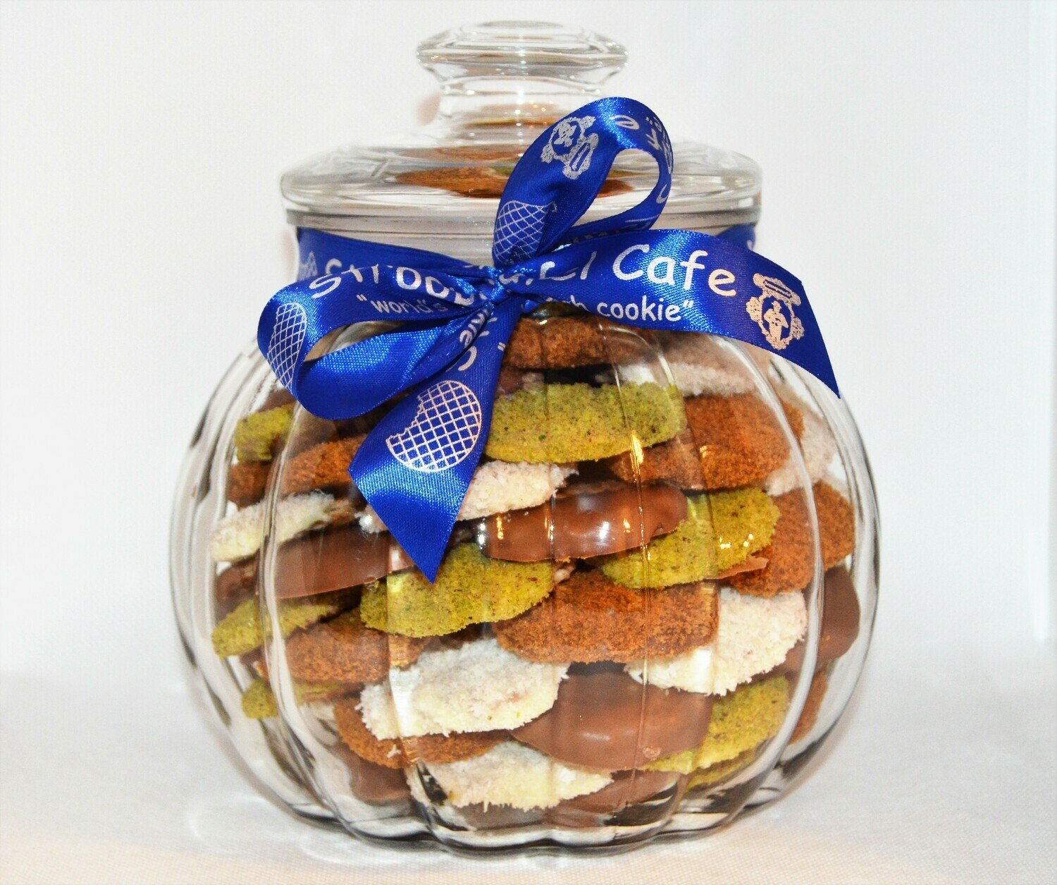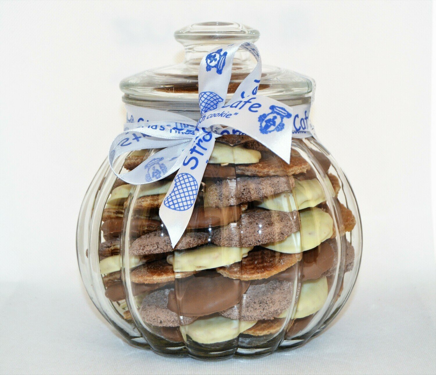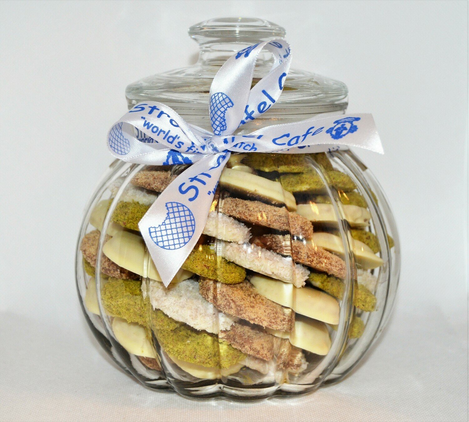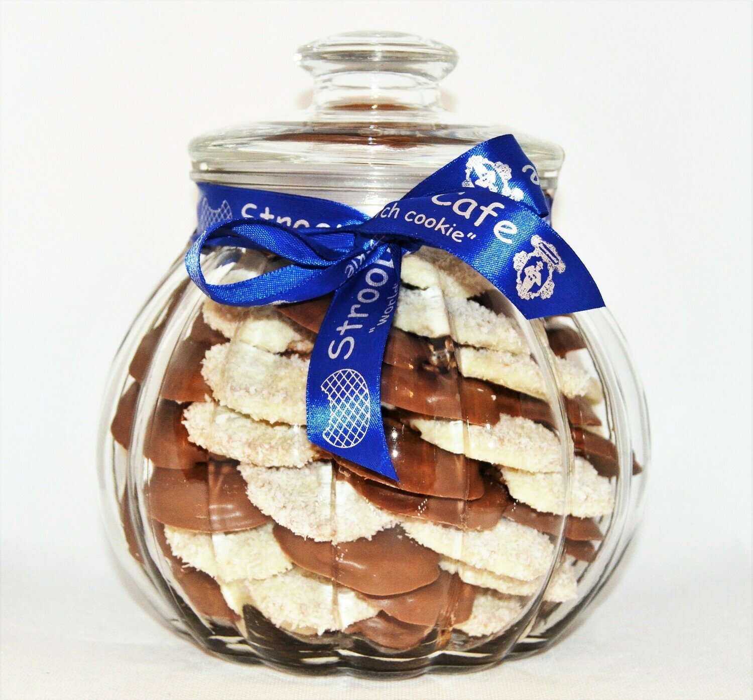 ~75 mini pieces of different mixed flavoured Stroopwafels arranged in circles on top of each other inside a glass jar. Each Stroopwafel is two thin layers of waffle filled with caramel in between, dipped in chocolate and covered with different flavour. Chewy and soft.