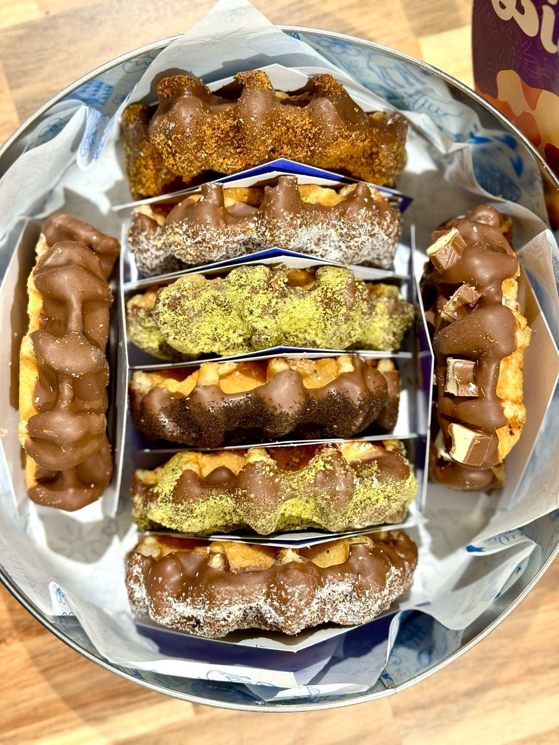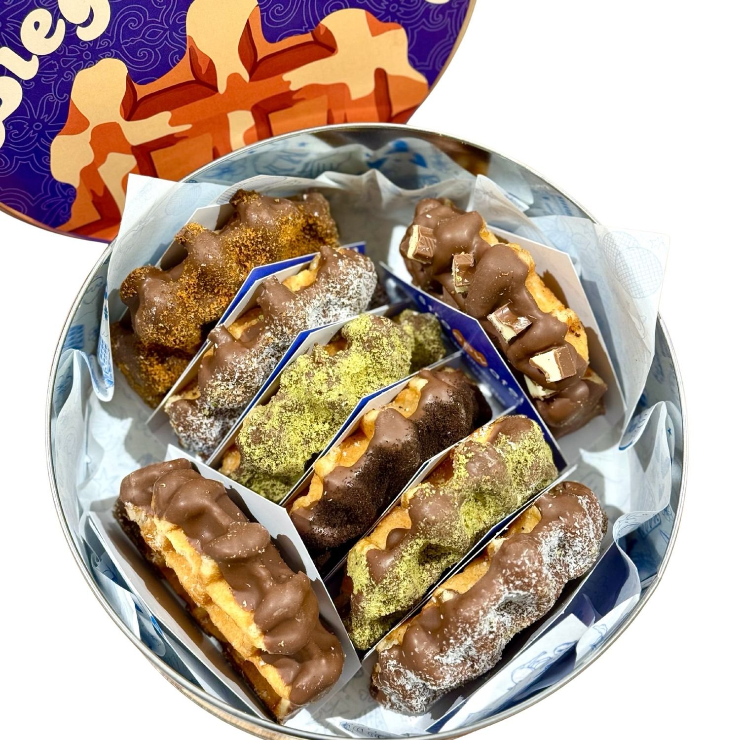 Tin with 8 pieces of Liege waffle covered with premium Belgian milk chocolate & mix flavors