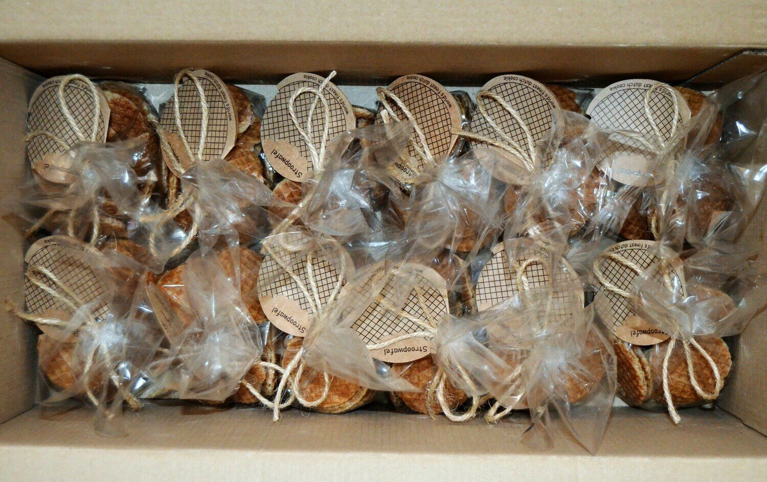 الوصف: ١٥ قطعة ستروبوافل صغيرة، مرتبة عشوائيًا في عبوة بلاستيكية. كل ستروبوافل عبارة عن طبقتين رقيقتين من الوافل، محشوتين بالكراميل. طرية وطرية.