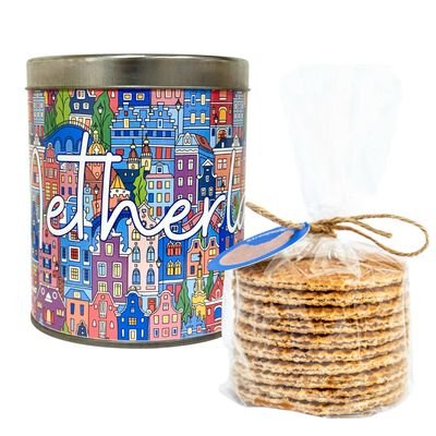 ١٠ قطع ستروبوافل متوسطة الحجم محشوة بالكراميل في علبة مميزة تحمل شعار "من هولندا إلى العالم". تذكار رائع، هدية، أو ذكرى جميلة.