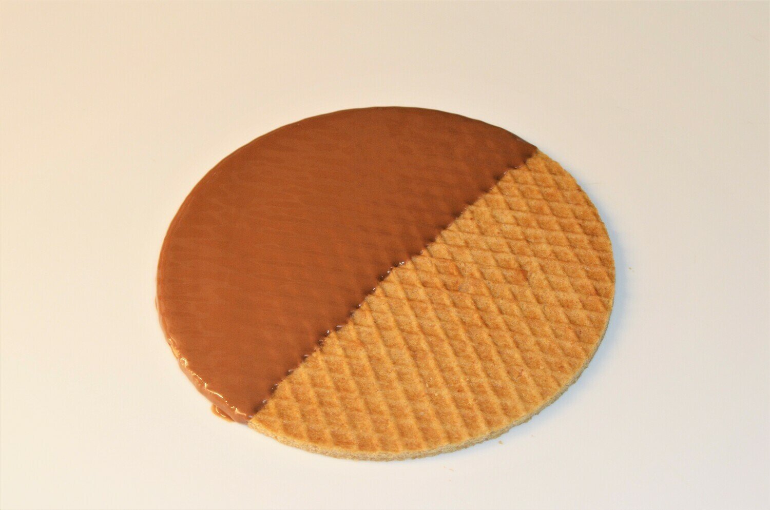 Description: Two thin layers of waffle filled with caramel, dipped in premium Belgian milk chocolate