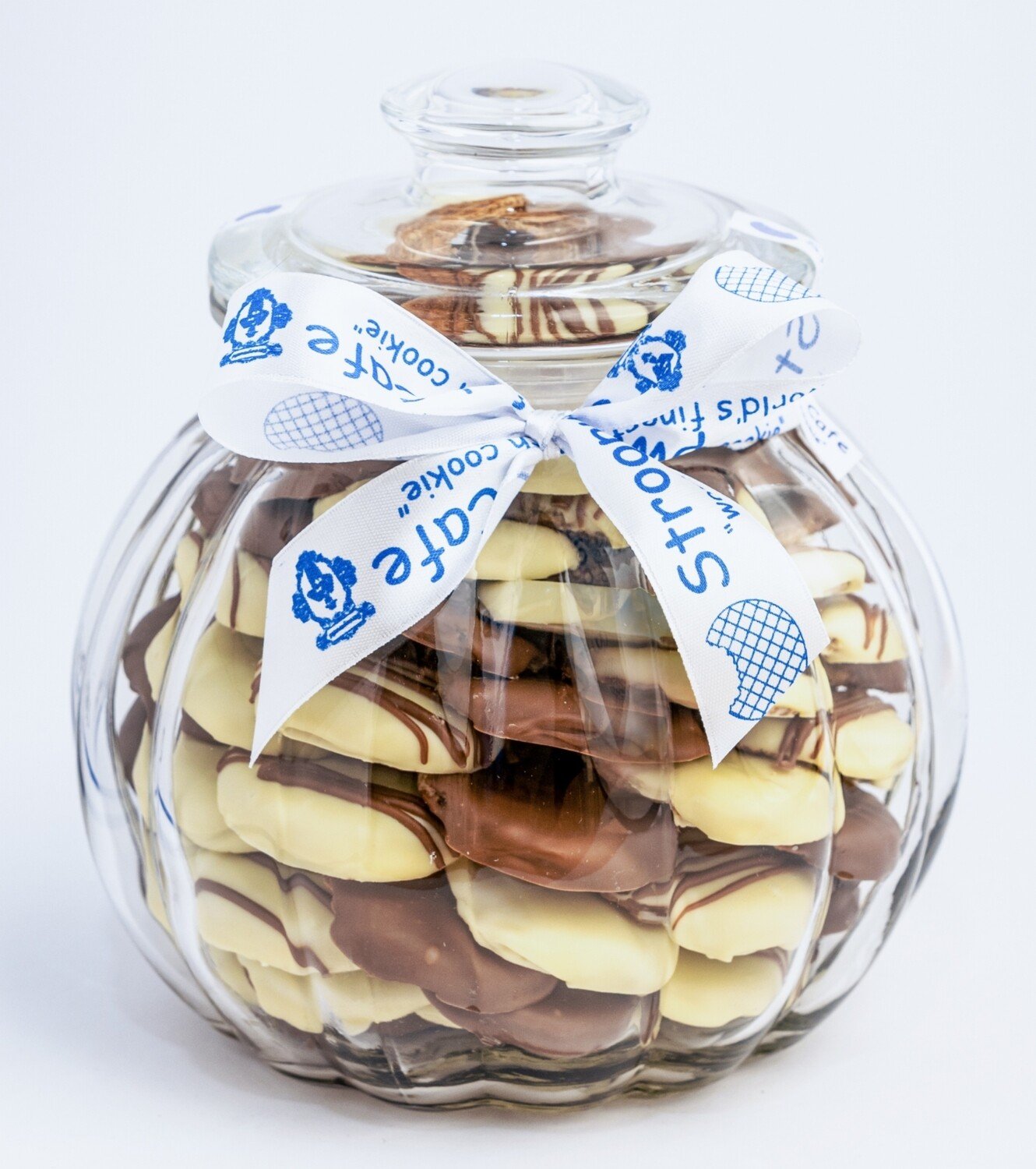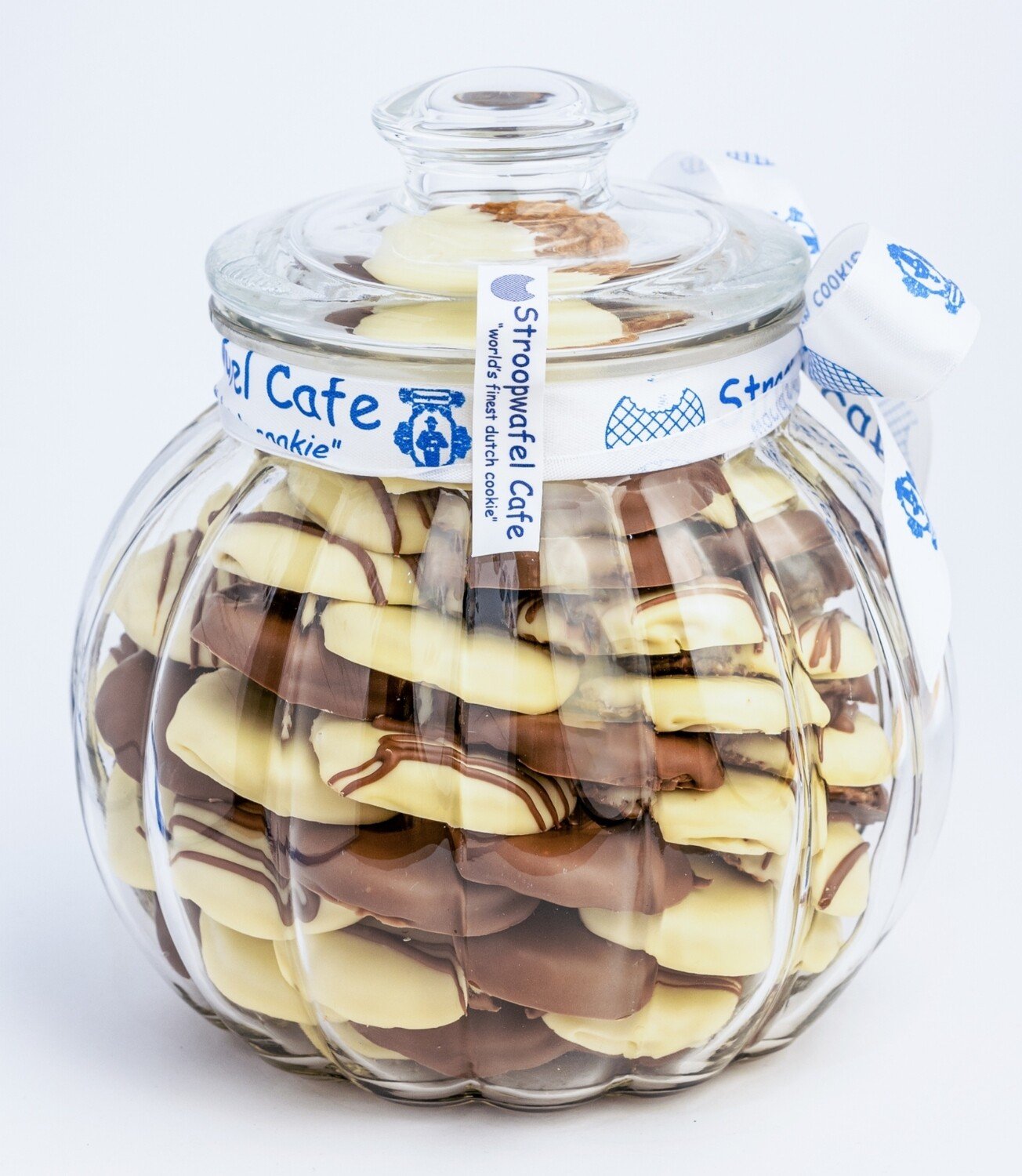 Mix of Belgian milk, Belgian White chocolate, and kinder Stroopwafel, arranged in circles on top of each other inside a glass jar. Each Stroopwafel is two thin layers of waffle filled with caramel in between. Chewy and soft.