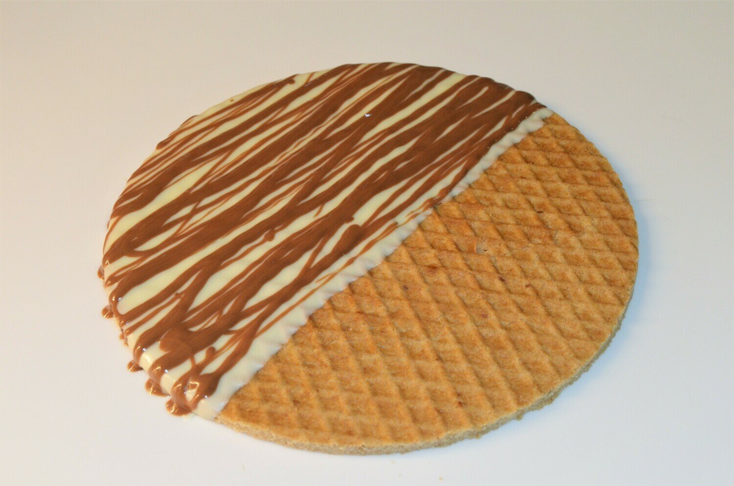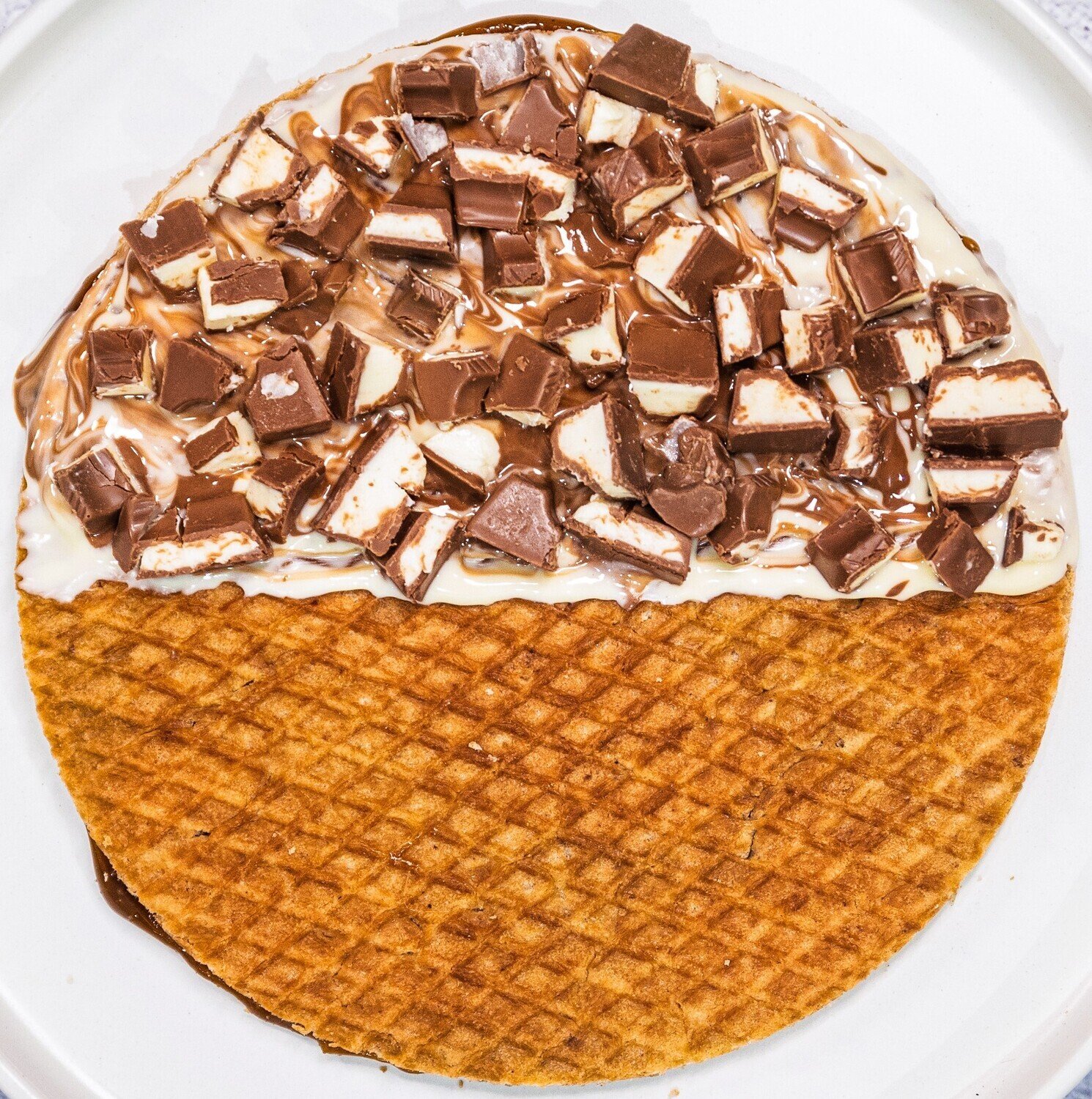 Description: Two thin layers of waffle filled with caramel, dipped in premium Belgian milk & Belgian white chocolate mixed together.