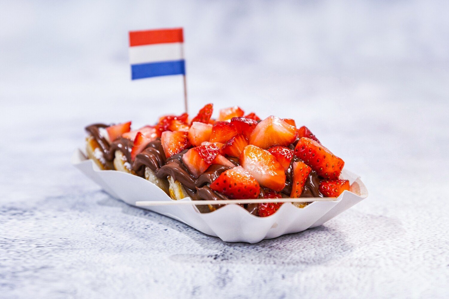 Poffertjes is a mini pancake that is made in the original Dutch way. Covered with Nutella and pieces of fresh Strawberry