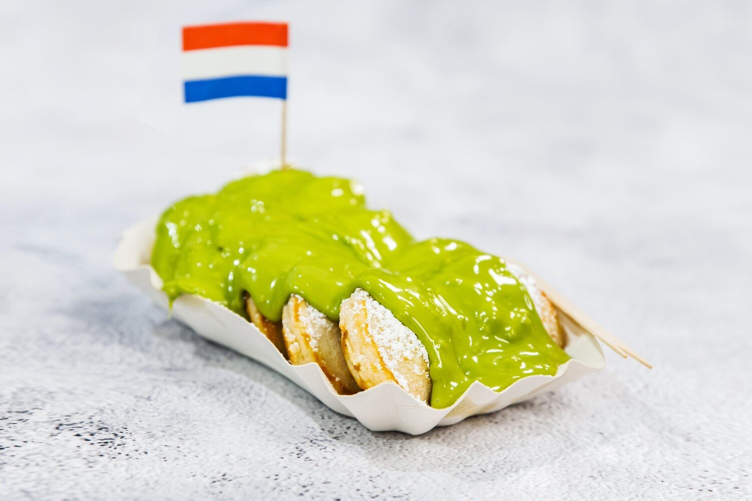 Poffertjes is a mini pancake that is made in the original Dutch way. Covered with icing sugar and Pistachio