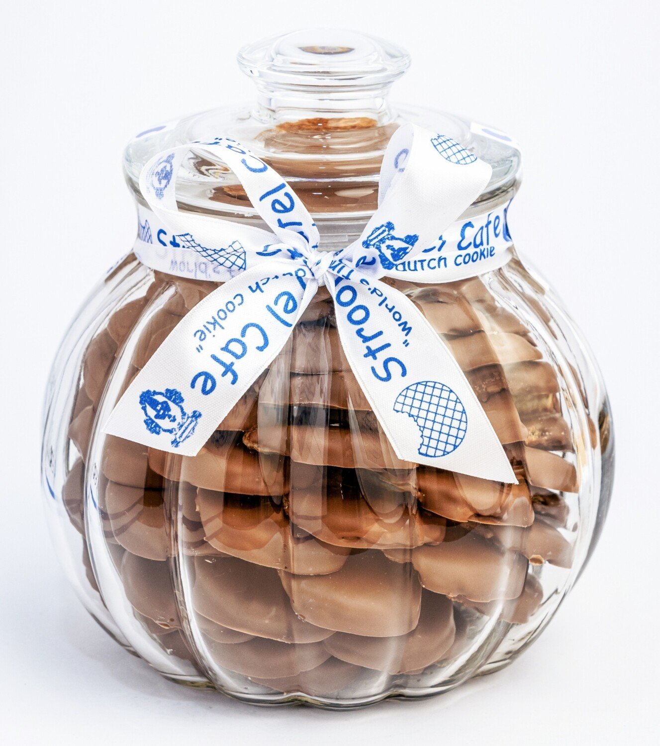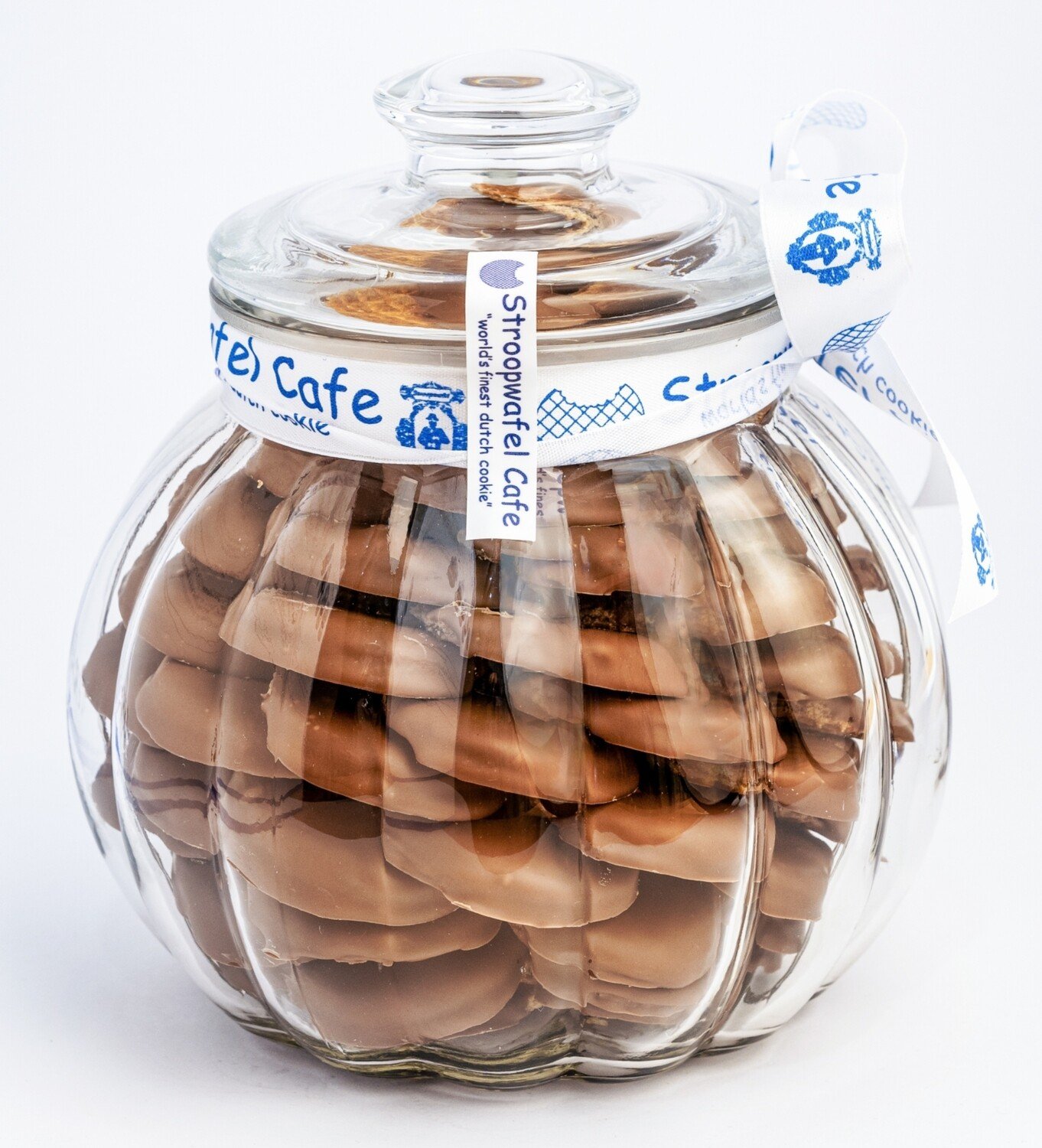 Premium pure Belgian milk chocolate Stroopwafel, arranged in circles on top of each other inside a glass jar. Each Stroopwafel is two thin layers of waffle filled with caramel in between. Chewy and soft.