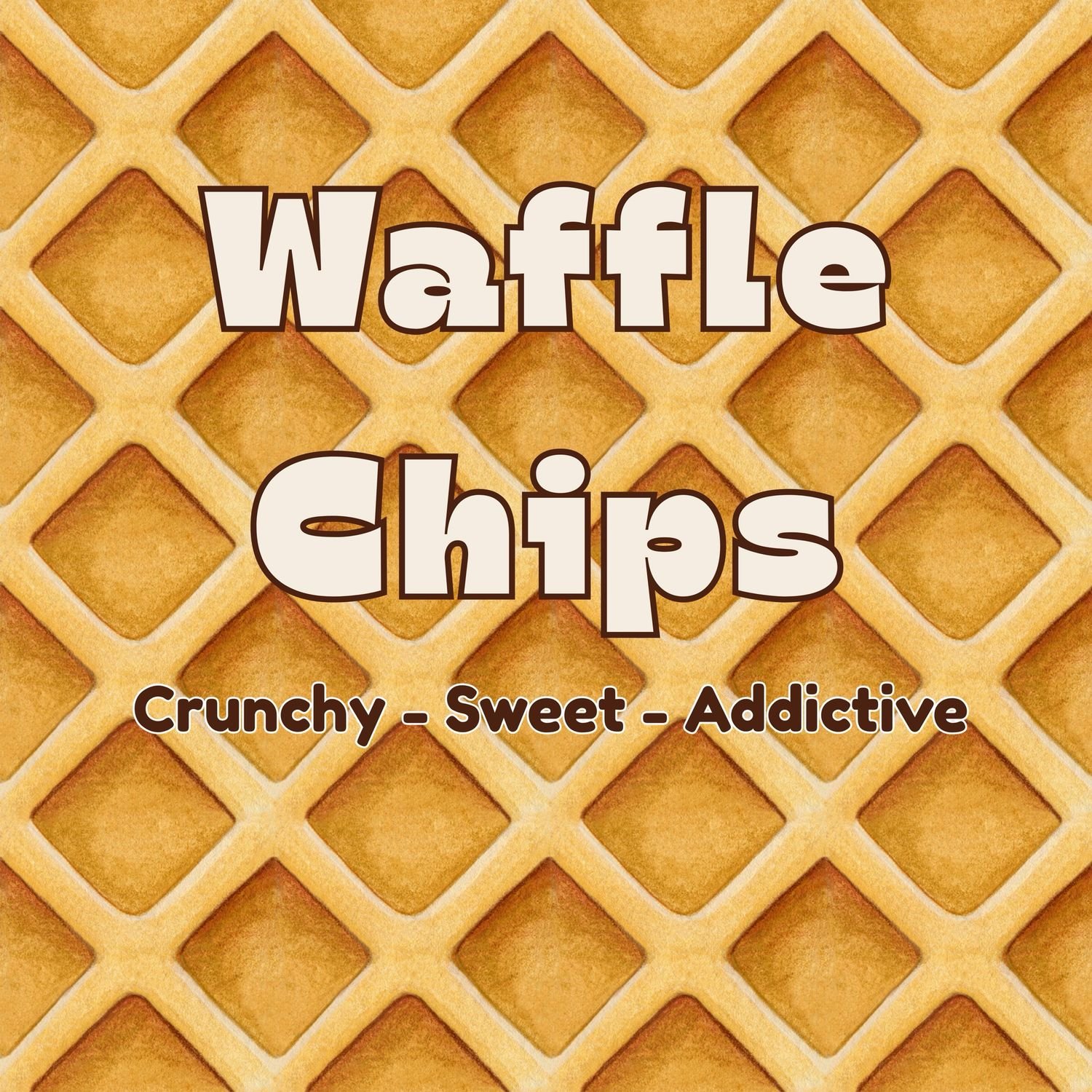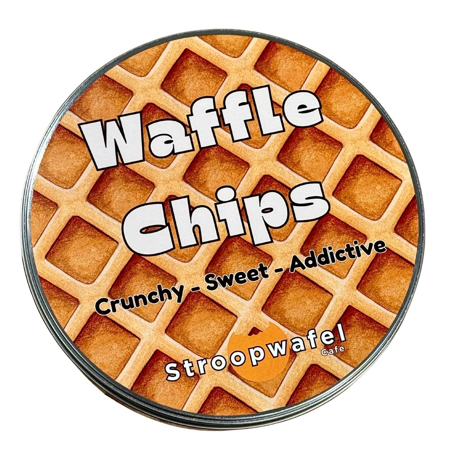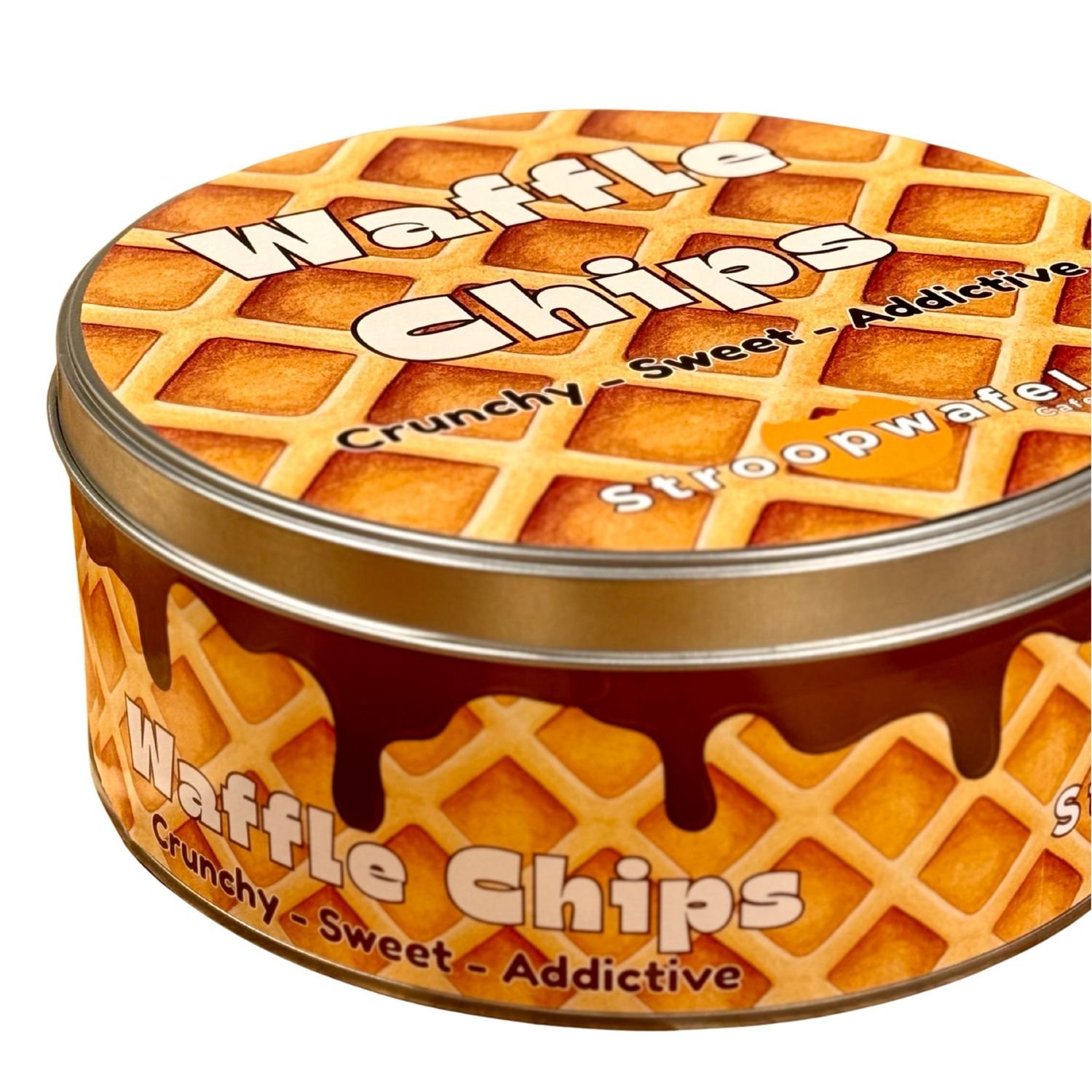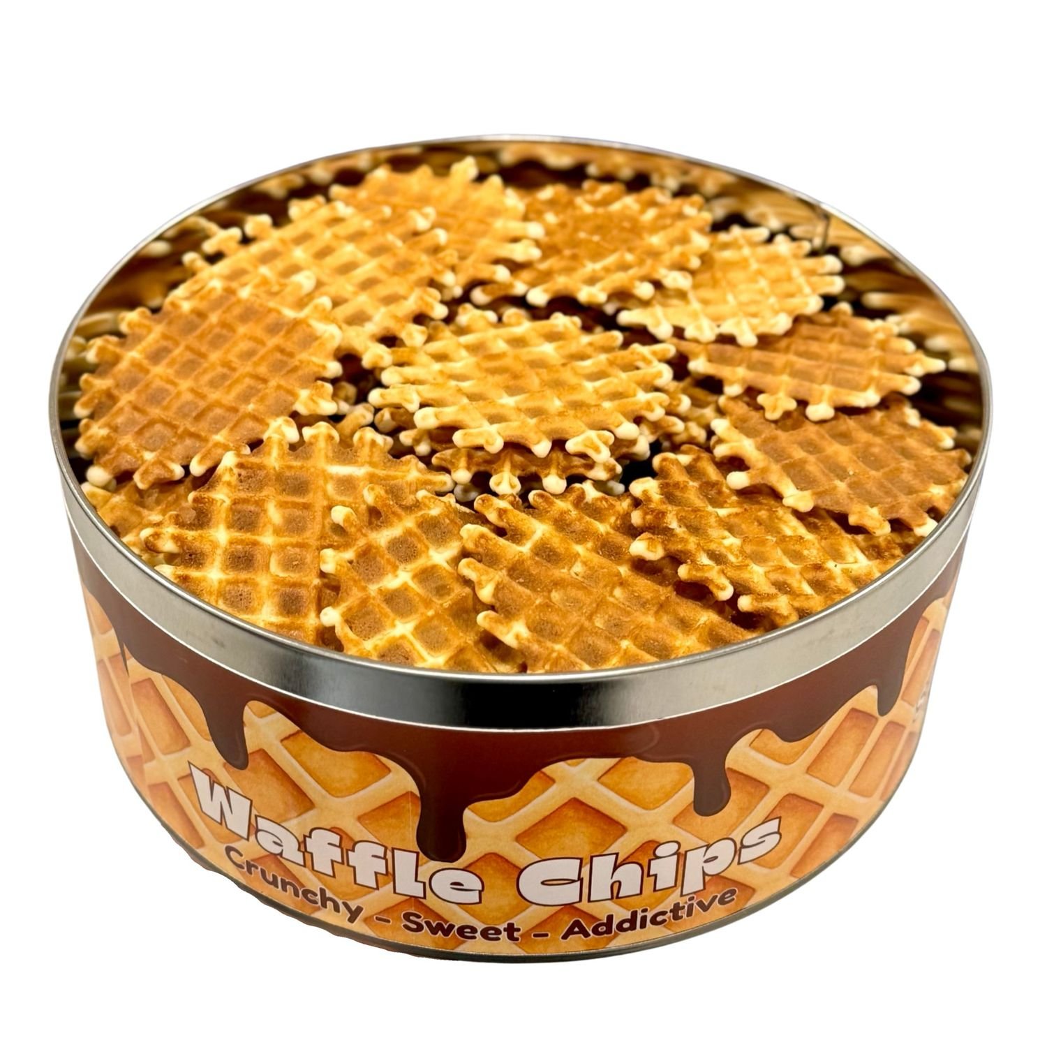 75 pieces of crunchy, golden waffle chips arranged in a waffle chips design tin