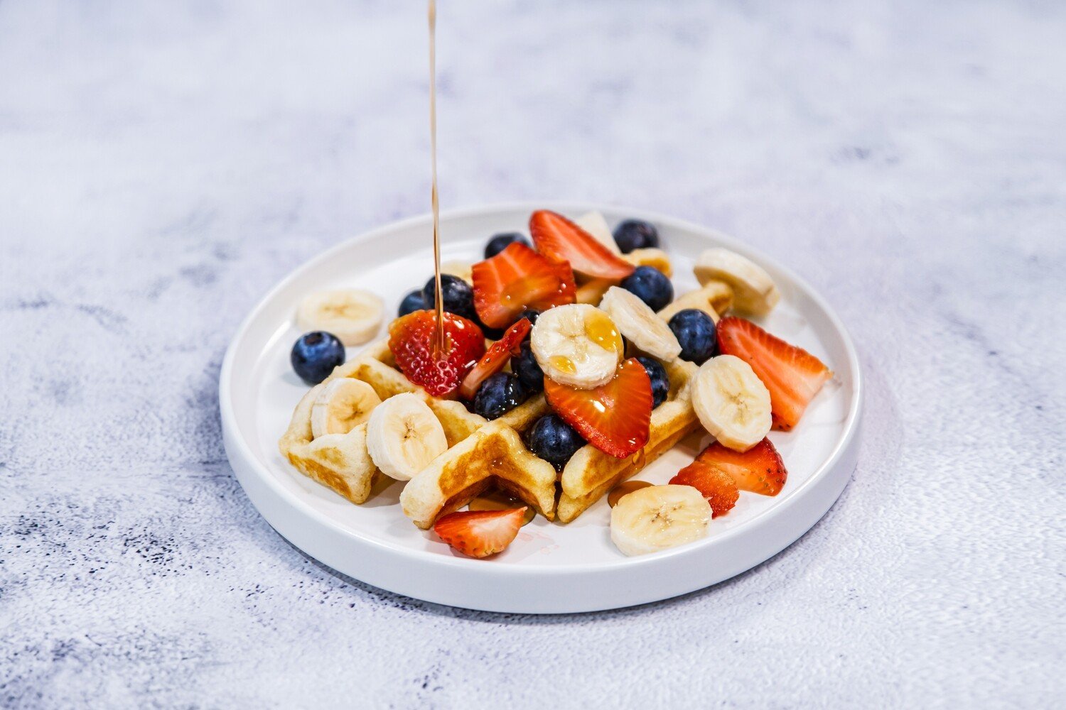 Brussels waffle with 100% original maple syrup and freshly cut fruits