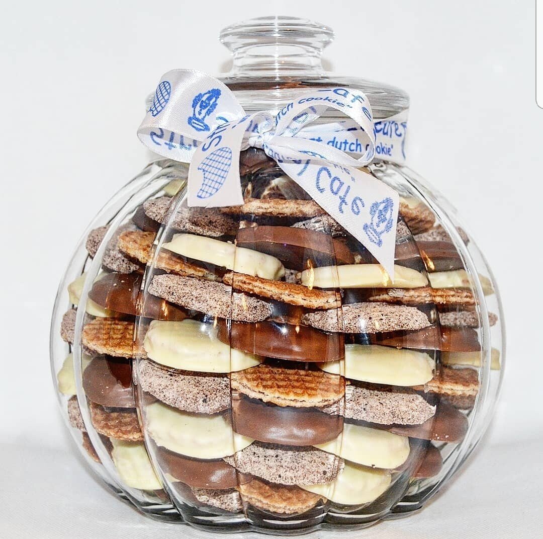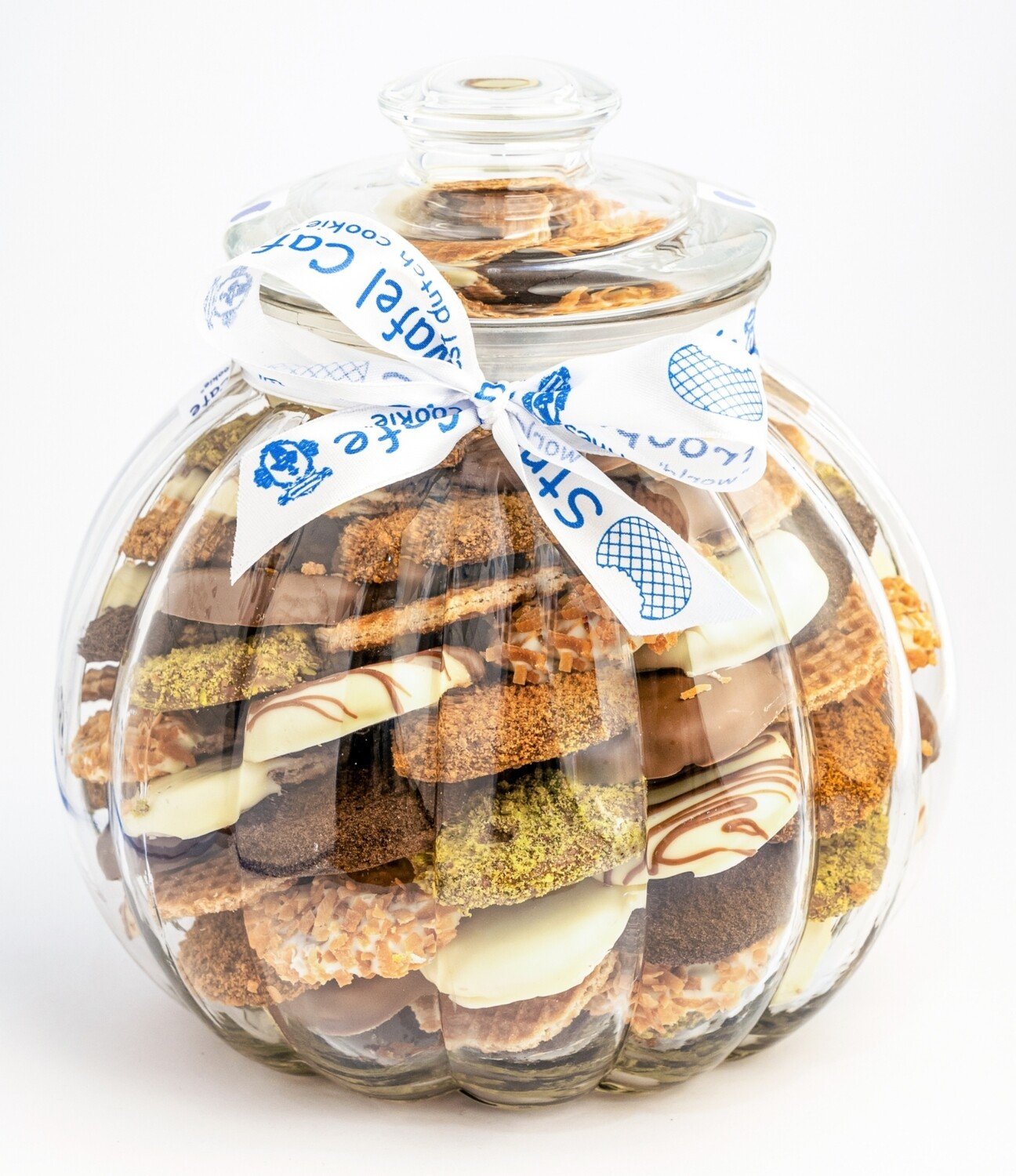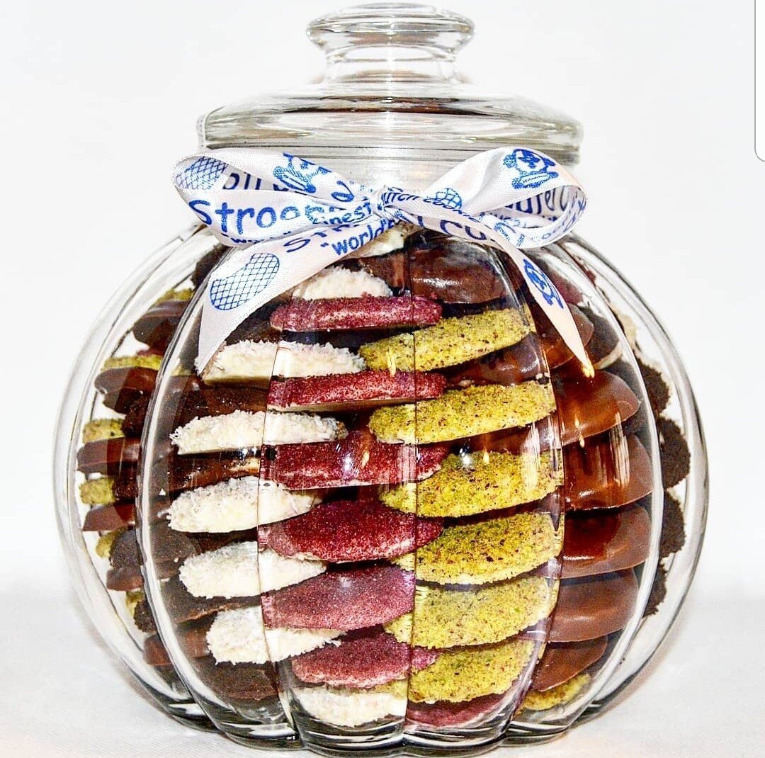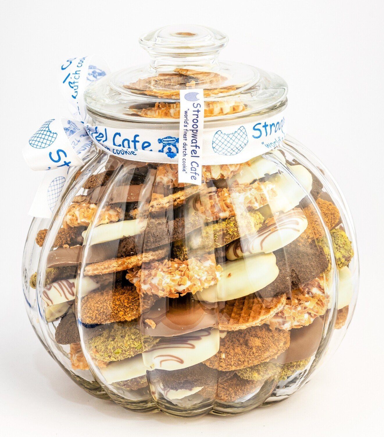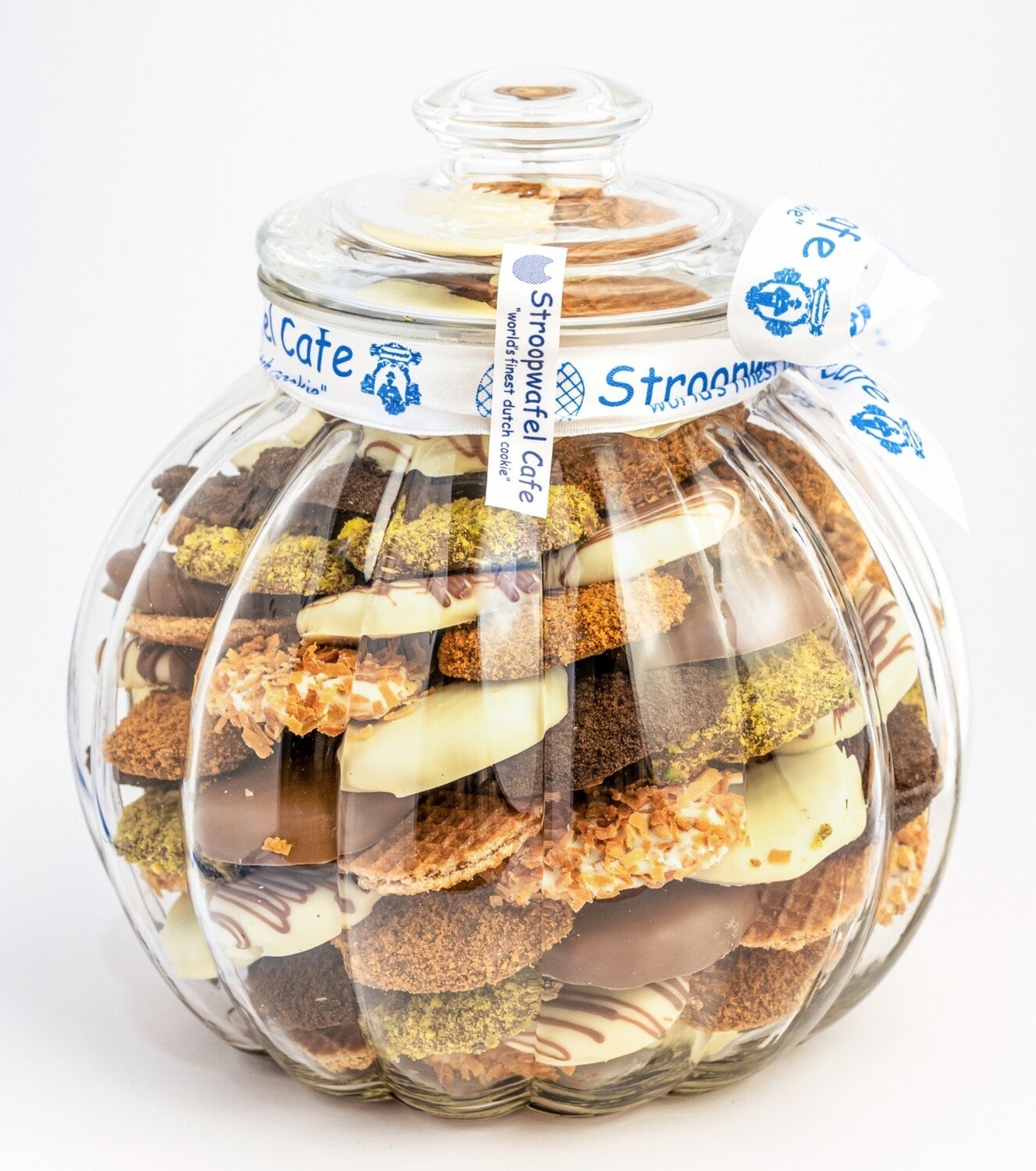 105 mini pieces of different mixed flavored Stroopwafels arranged in circles on top of each other inside a glass jar. Each Stroopwafel is two thin layers of waffle filled with caramel in between, dipped in chocolate and covered with different flavour. Chewy and soft.